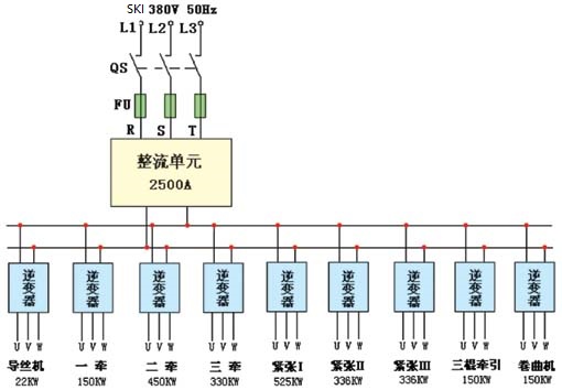 九臺(tái)傳動(dòng)電機(jī)共用一臺(tái)大功率整流單元,為其提供共用的直流母排,母排下連接各個(gè)單元逆變器。由于滌綸纖維牽伸時(shí),有的電機(jī)處于發(fā)電狀態(tài),有的電機(jī)處于電動(dòng)狀態(tài),處于發(fā)電狀態(tài)的電機(jī)其逆變器單元發(fā)出電能送到直流母線,再進(jìn)行電能的從新分配,節(jié)約了電能,降低了消耗成本。直流母線側(cè)提供制動(dòng)單元,實(shí)現(xiàn)快速制動(dòng),全線緊急制動(dòng)時(shí)間小于5秒鐘,制動(dòng)單元能將制動(dòng)電能回饋電網(wǎng)。